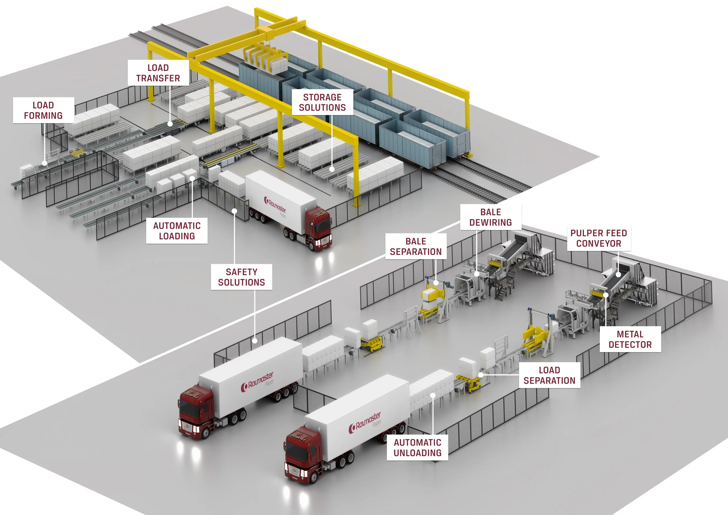 Raumaster Paper bale handling is designed to preserve the pulp bale form throughout the transit process. Fully automated systems form bale loads according to the transportation requirements. Loads can be transferred to storage or to shipment uninterruptedly 24/7. These high-capacity systems do not damage the bales during handling and keep the personnel safe from loading areas.