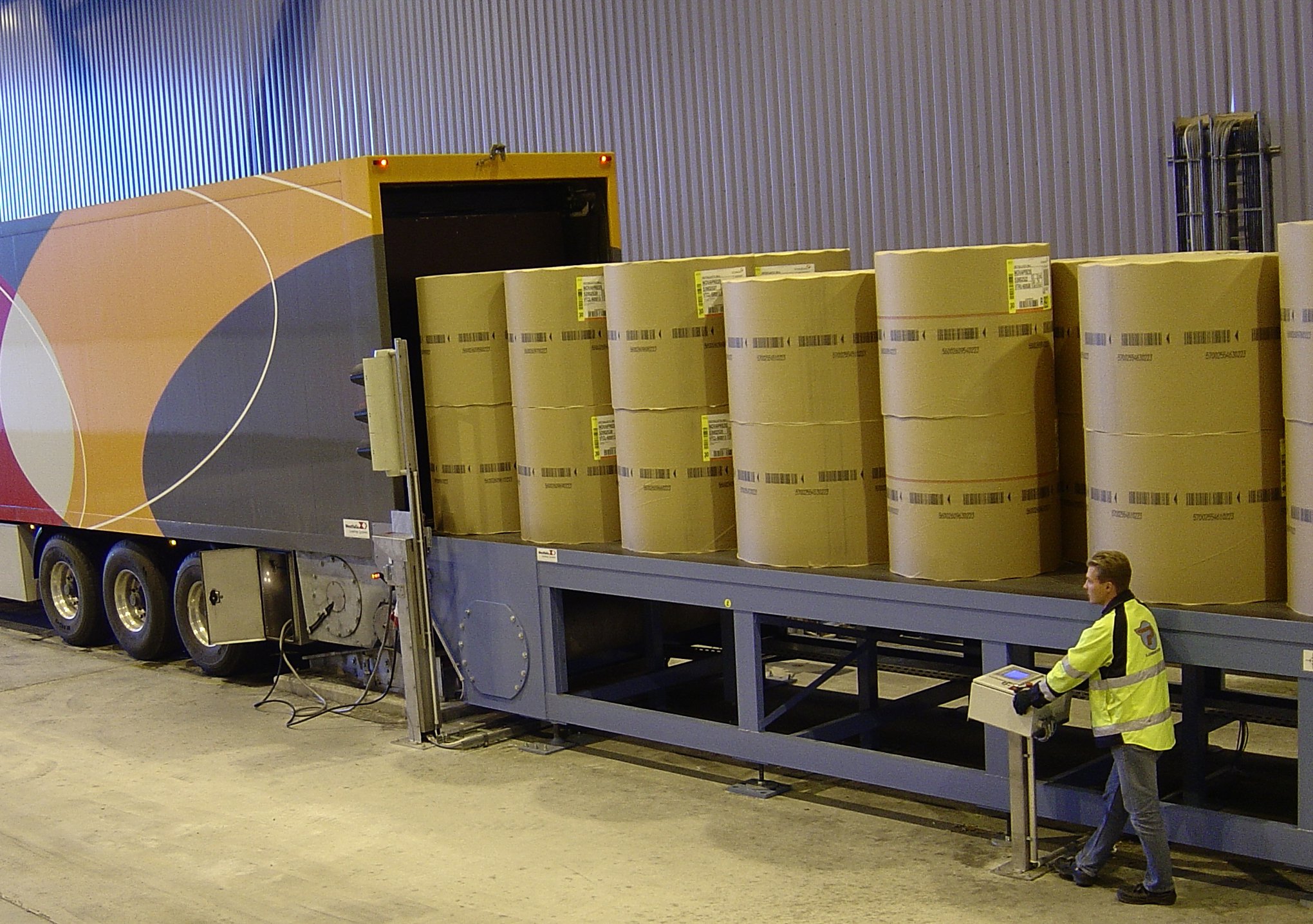 Our first fully automatic loading system was delivered to Kemi in 2006. The project handled rolls and pallets transported from the warehouse to the harbour by truck. Belt conveyors loaded the cargo automatically into special trailers equipped with their own matching conveyors. At the harbour, the load was automatically transferred onto receiving belt conveyors.